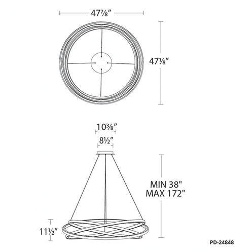Veloce 48in LED Chandelier 3000K in Titanium. Interlocked bands of metal loop around and around on this simple yet oblique design, a formal puzzle that inspires awe and envy in your guests. Available in black or sleek titanium, Veloce's rings can be adjusted for a more personalized shape. Thin, coated cables maintain a clean, refined look while also delivering power to the design. Rotatable aluminum edge-lit metal bands with silica gel diffusers that maximize brightness. Ultra-sleek electrified cables eliminate the need for clunky power wires. Height is simple to adjust through push pin connectors on the canopy. Longer heights available by special order. Universal Input Voltage Driver (120V-240V-277V) inside fixture, can fit on a pancake junction box. Custom CCT options available by special order. Smooth and continuous dimming with an electronic low voltage (ELV) or 0-10V dimmer. High Powered Replaceable LED Module CRI: 90, Rated Hours: 50,000, Color Temp: 3000K Standards: ETL & cETL UL 1598 listed for damp locations.